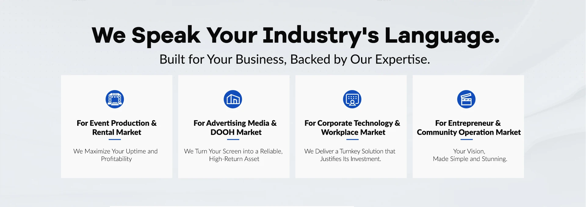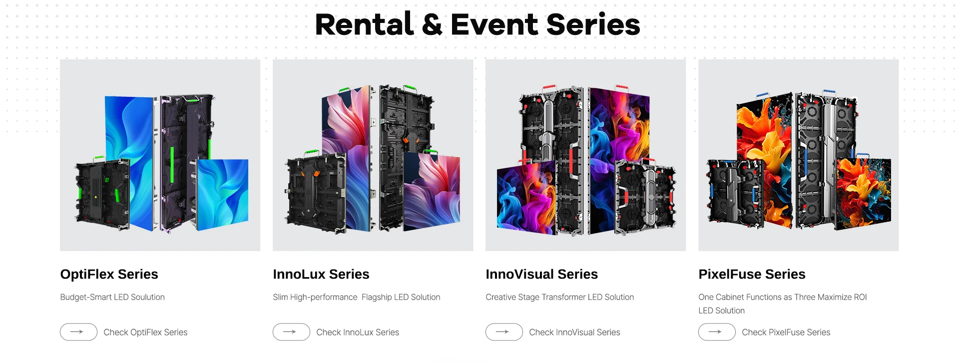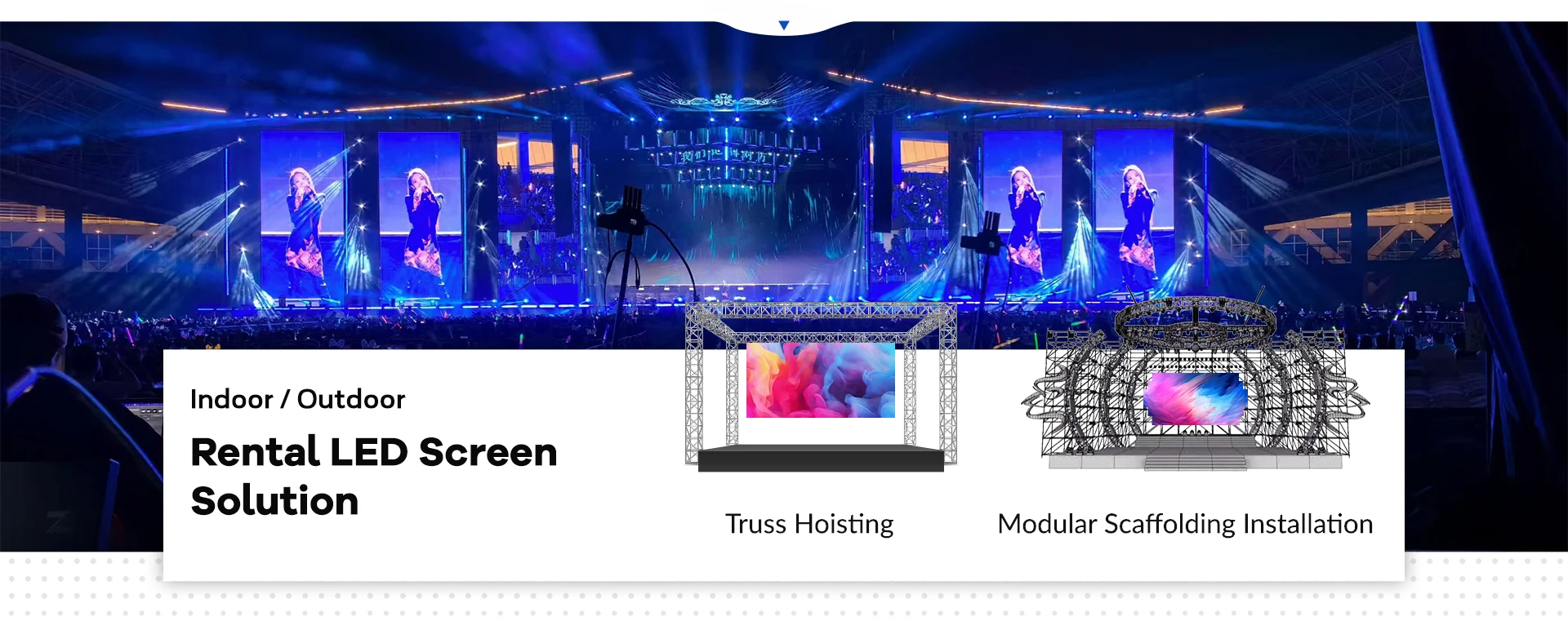 Principais produtos:Tela de LED para aluguel, tela de LED para exterior, parede de LED para interior, tela de LED transparente, tela de piso